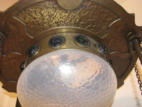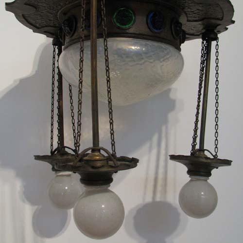 Arts and Crafts Brass Chandelier with Colored Glass Inserts