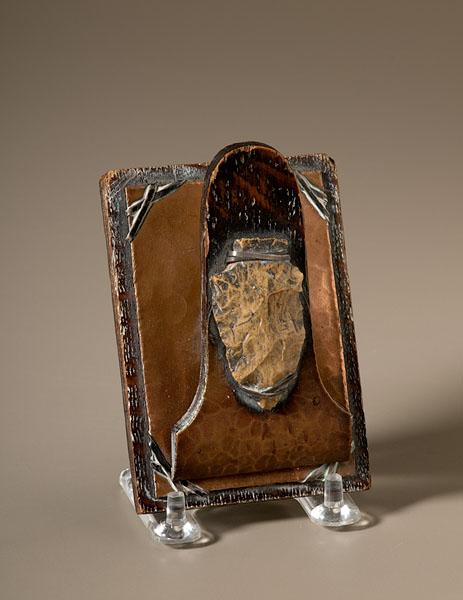 ca 1900, hammered copper with applied projectile point fastened with silver straps, on an oak base. Unsigned, stamped copper and silver. 2" high x 4" long x 3" deep.