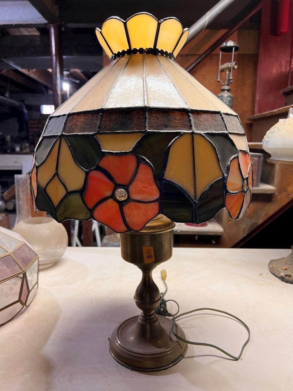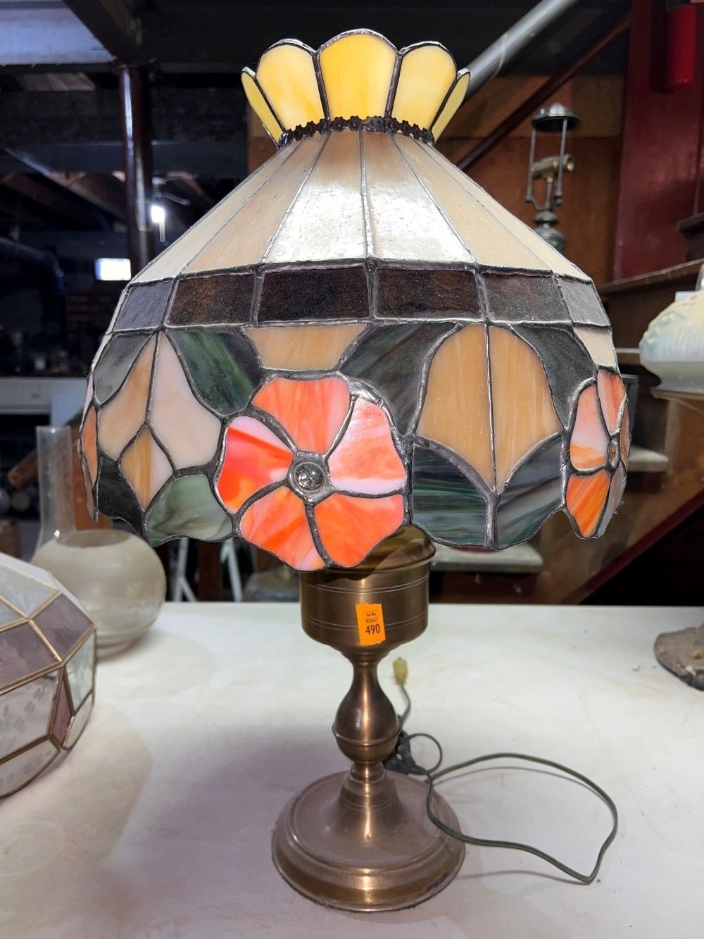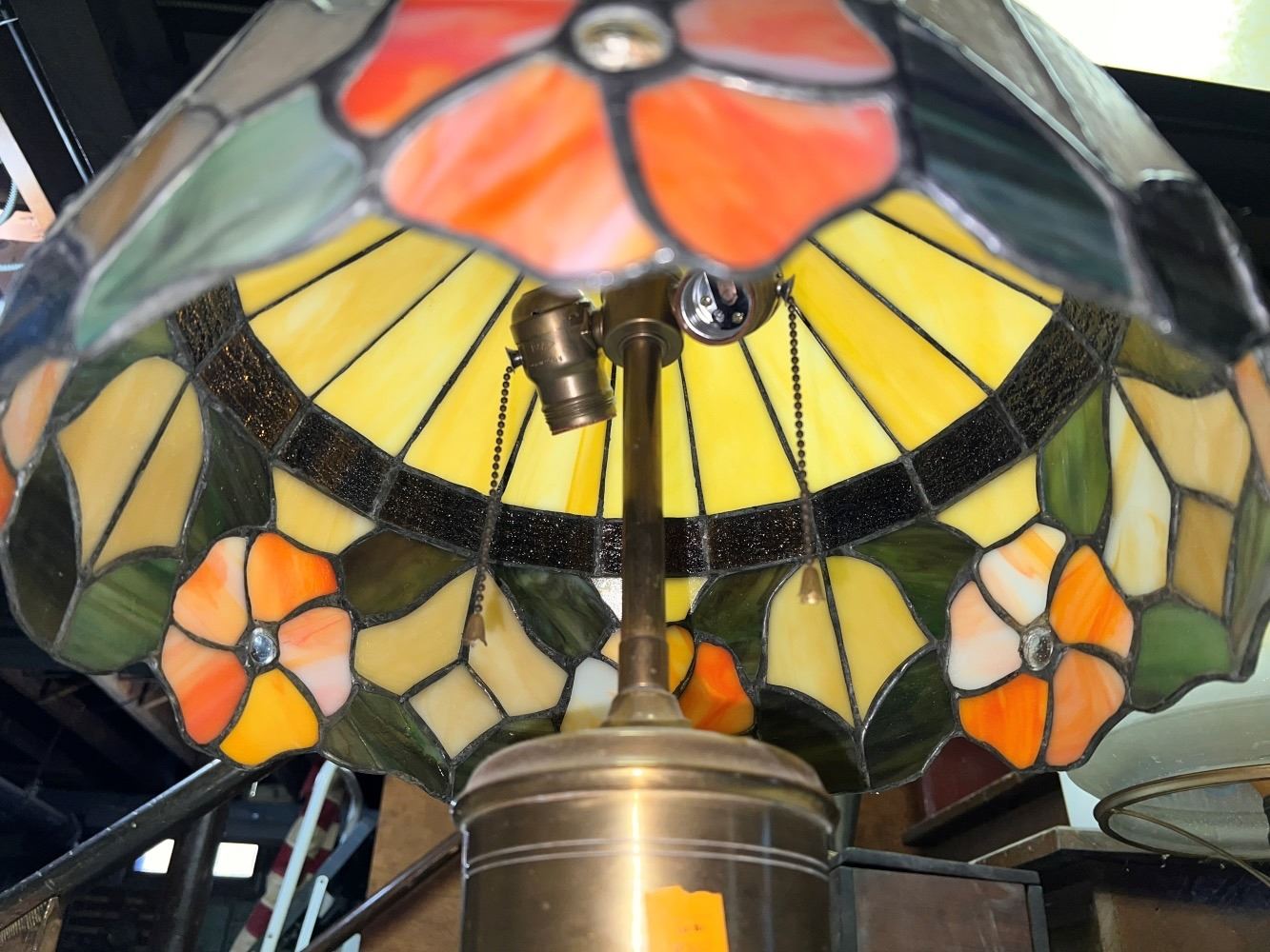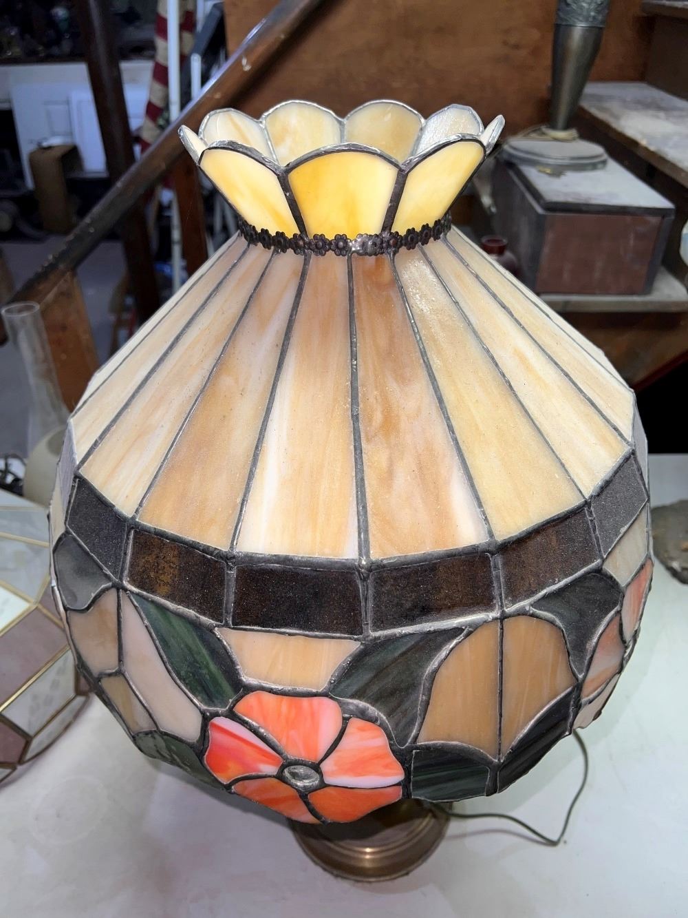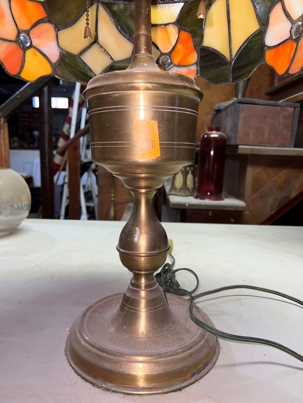 Arts and crafts brass lamp, leaded shade with flowers. Needs to be rewired. Lifetime Collection. Measures approx. 25 inches tall x 15 inches wide.