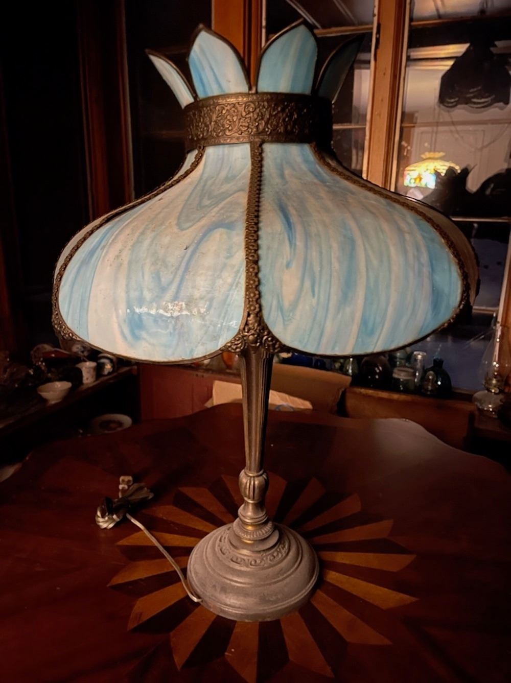 Arts and Crafts blue slag glass table lamp with vintage base, from the lifetime collection
