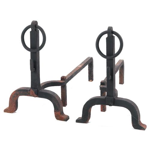 Arts and Crafts andirons, wrought iron with circular ring pull, original worn black finish, 12"w x 20"d x 18"h, very good condition