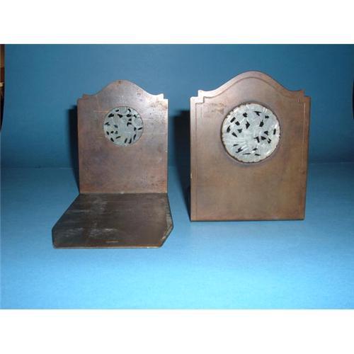 A pair of Arts and Crafts bookends of brass with a round piece of Chinese jade situated towards the central top of each bookend. Each piece of jade has a 2 inch diameter and sits in the brass. Cleveland, Ohio, Potter Studio.