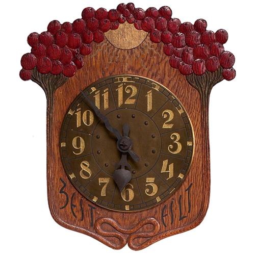 Arts and Crafts clock, brass face, wooden body, carved and painted red fruit, painted sunburst design at top, carved tree trunk to sides, with pendulum, very good condition, 9"h x 8.75"w