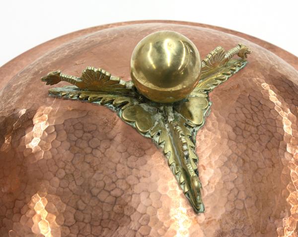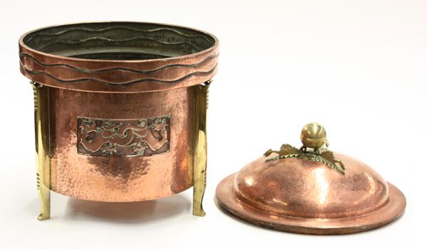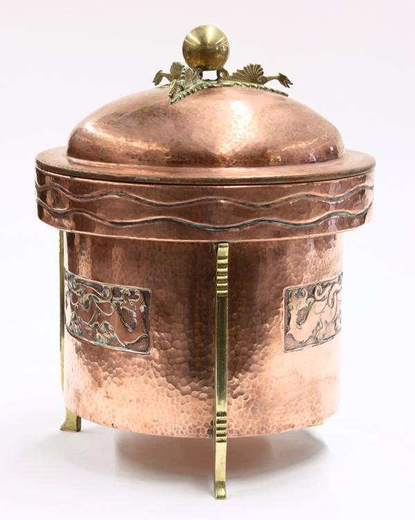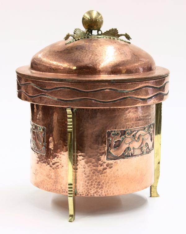 Arts and Crafts hammered copper jardiniere circa 1910, executed by Joseph Sankey and Sons, having a finial capped lid with griffin supports above the columnar body having stylized figural reserves and rising on brass feet, 15''h x 12''w
