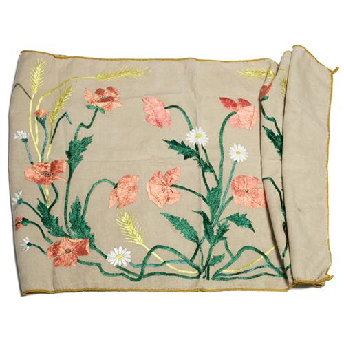 Arts and Crafts table runner, elaborate and colorful embroidered poppy, daisy and wheat design, gold cord applied to edges, 26in.w x 54in.l, one minor stain