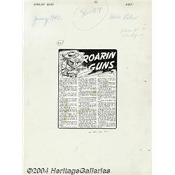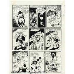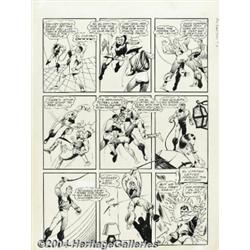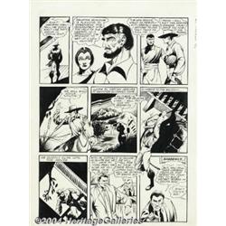 <B>Arturo Cazeneuve (attributed) - Hello Pal Comics #1 Complete 7-page Story, El Capitan in "Mission Unknown" Original Art (Harvey, 1943).</B></I> A Gestapo bully shows his lack of class by hitting a lady, setting the stage for his well-deserved comeuppance. El Capitan is riding into Santa Rio, and the whip-crackin' wonder launches an all-out assault on Hermann Goering's minions. The foreshortened action poses would make Lou Fine and Gil Kane proud! Once his work is done, the daring Guardian of Democracy does not wait for any embarrassing thanks, he simply rides off into the South American horizon, like the strong, silent hero he is! As a bonus in this lot, a one page text story, "Roaring Guns," is included. It sports a blazing spot illustration of a hammer-fanning gunslinger. The story is in overall Very Good condition, with only a paste-on caption missing on page one. The art also has a well done paste-on art correction in the final panel. The overall paper size is 15" x 20", with a 13" x 18" image area. Amigos, for exotic action-adventure, you will have a hard time besting this peerless Golden Age El Capitan thriller. <BR><BR><B>Important notice:</B> Heritage usually auctions material at the rate of 200-250 lots per hour. On some occasions eBay Live bid software or the Internet may not be able to keep up with the pace of the auction. We recommend placing a realistic absentee bid now as insurance to avoid disappointment. Occasionally the auctioneer may eliminate or reject an eBay Live bid, and the auctioneer may also reopen a lot after the close of the eBay live bidding (usually because we missed an audience bid), and may reject your bid even if it shows you as the winning bidder. By bidding via eBay Live, you agree that Heritage may award the lot to another bidder at its sole discretion under the circumstances described above or any other reasonable circumstances. Since eBay bids are not shown to us until we open the lot on the floor, we treat those bids just like floor bids. In most cases the floor responds before the eBay bid is presented to us, due to Internet lag time, so for consistency we have made it a policy that floor bids are always considered first over tie eBay live bids. Also please note that all Heritage lots purchased through eBay Live carry a 20% Buyer's Premium. Please make sure you read the Terms and Conditions before you bid.