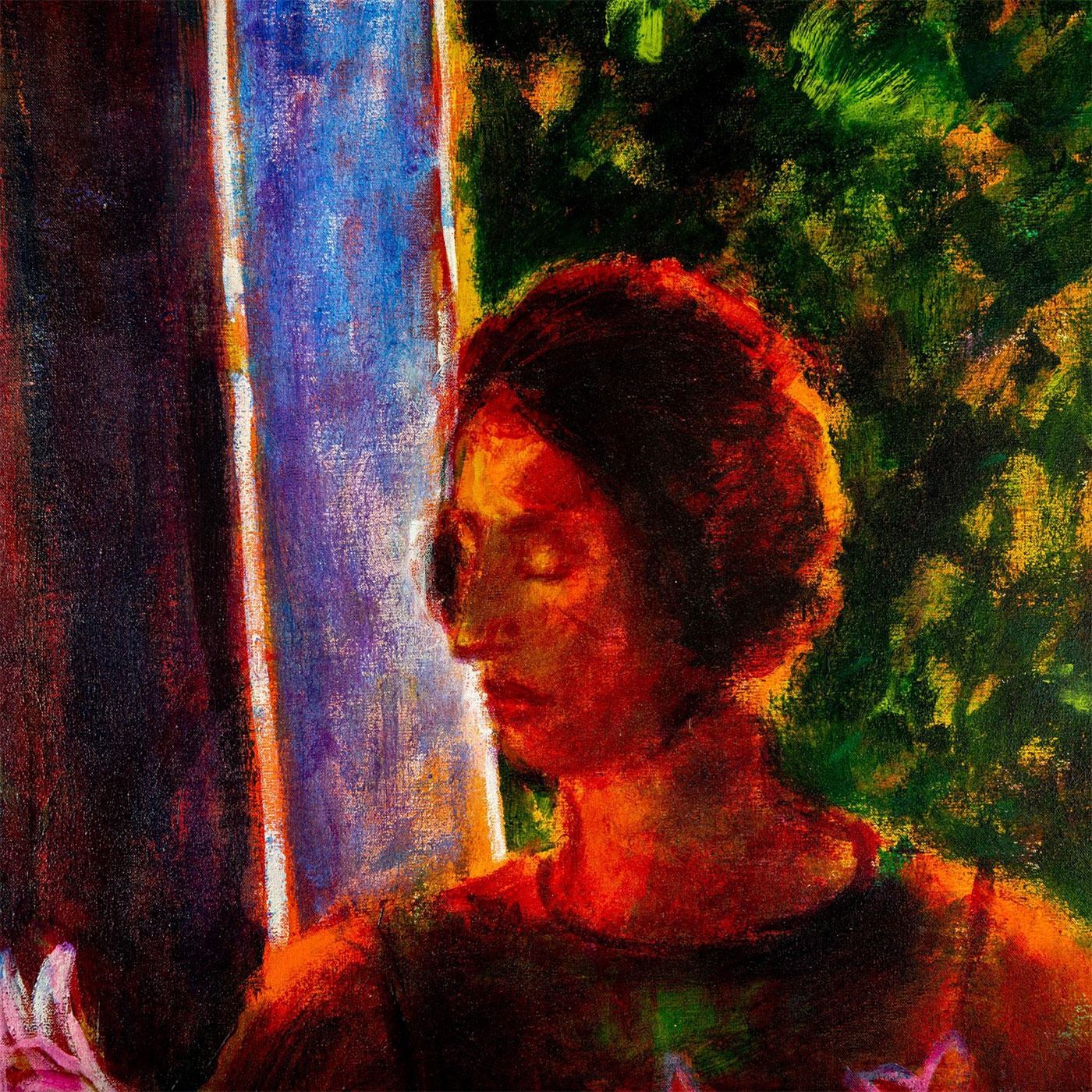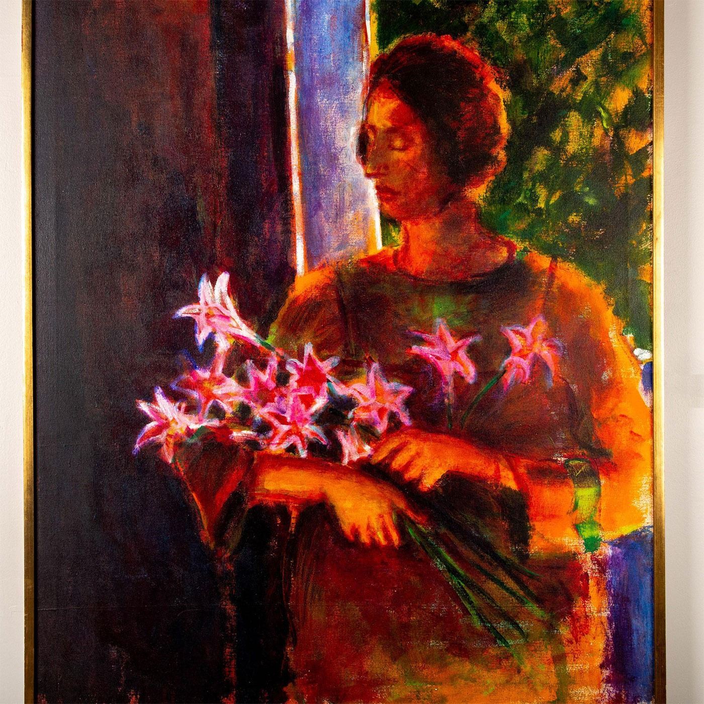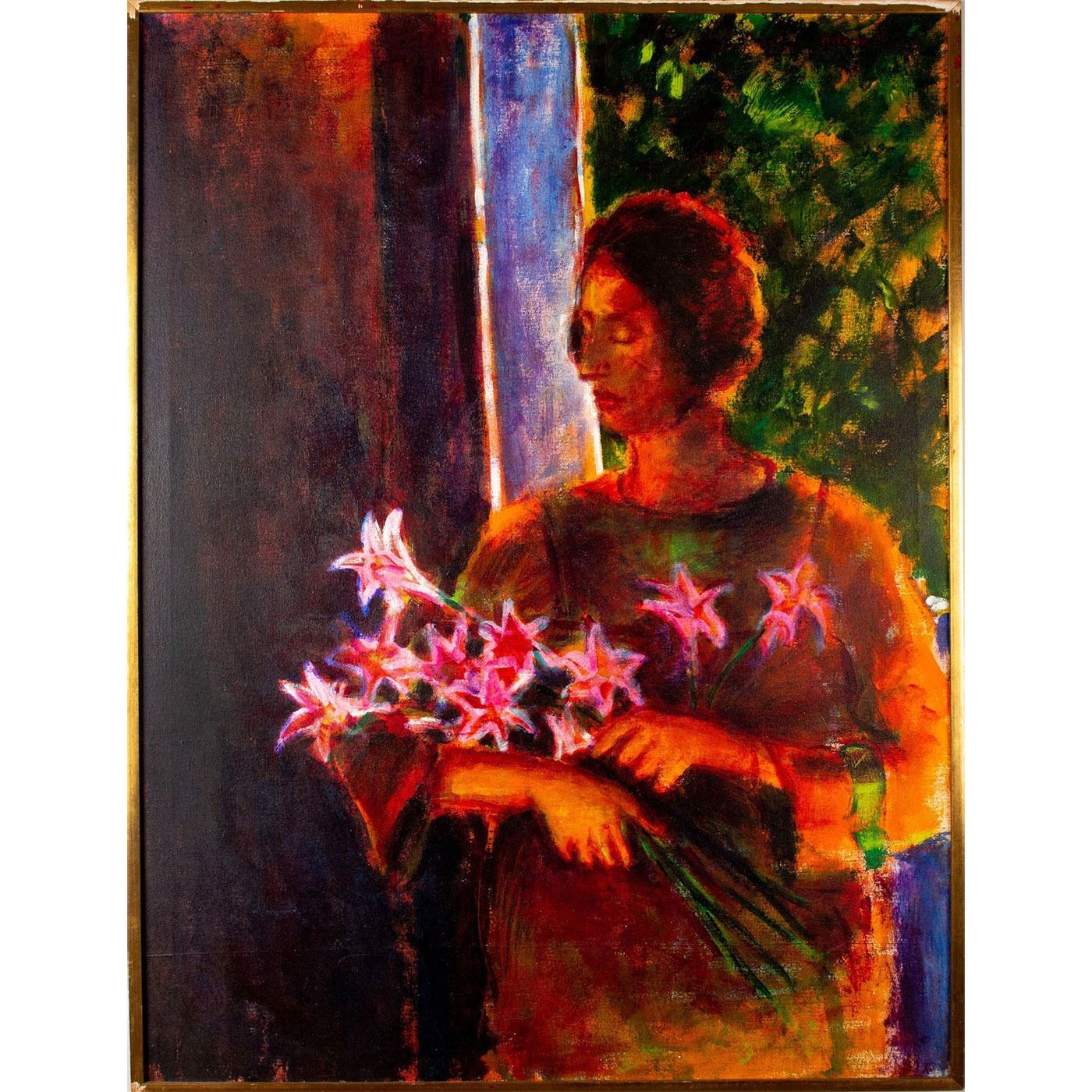 Portrait of a woman holding pink lilies next to a window. Signed and dated top right. Wooden frame with gold accent. Some damages to the frame. Sight size - 47.75"H x 35.5"W. Frame size - 49"H x 37"W. Signature/Marking Location: Top right Material/Technique: Painted Medium: Oil on Canvas