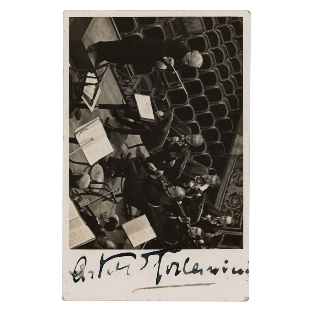 Vintage glossy 5.5 x 3.5 postcard photo of Arturo Toscanini during rehearsals with his orchestra, signed vertically in the right border in fountain pen. In fine condition, with some light silvering to the image.