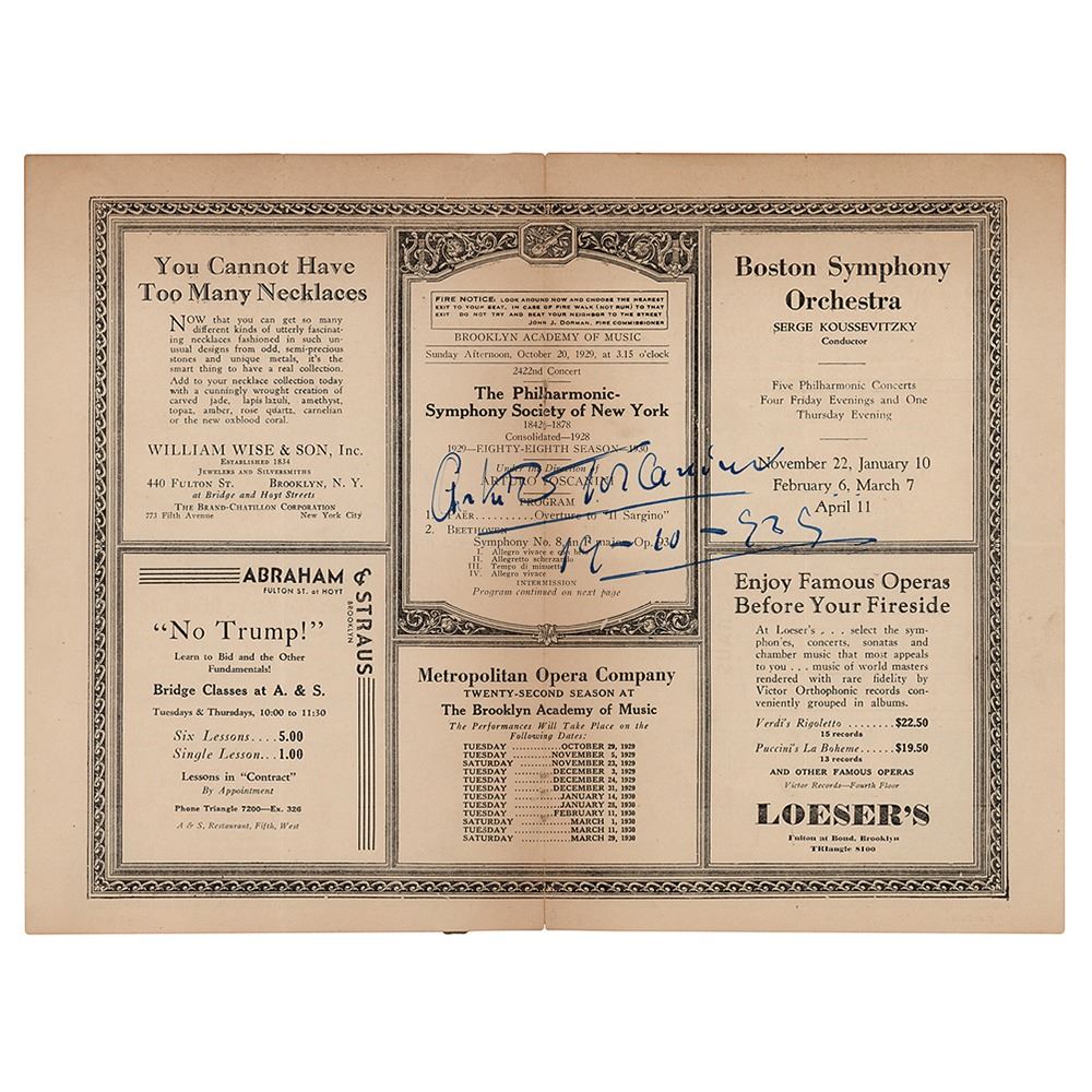 Program for a concert at the Brooklyn Academy of Music on October 20, 1929, 12 x 9, signed at the center in bold blue fountain pen, "Arturo Toscanini, 19-10-929." In very good to fine condition, with faint toning to the central vertical fold, and heavier toning and mounting remnants on the reverse.