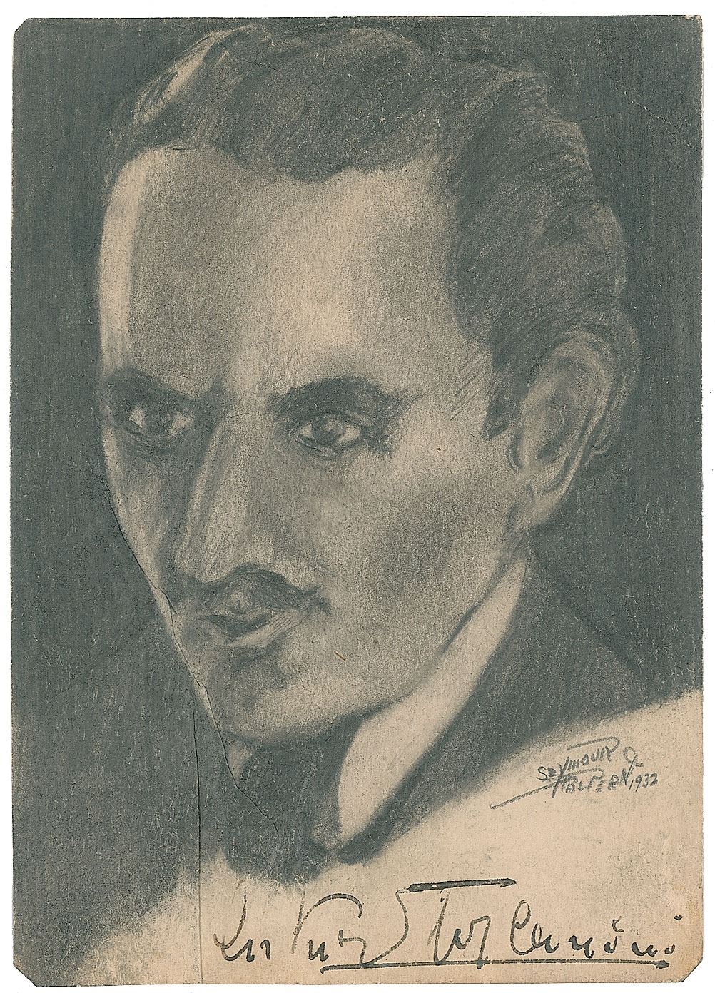 Unique original pencil drawing of the great conductor accomplished by Seymour Halpern on an off-white 4 x 5.5 sheet, signed below by the subject in ink, "Arturo Toscanini." Also signed and dated in the lower right by the artist, "Seymour Halpern, 1932." In very good condition, with several creases.