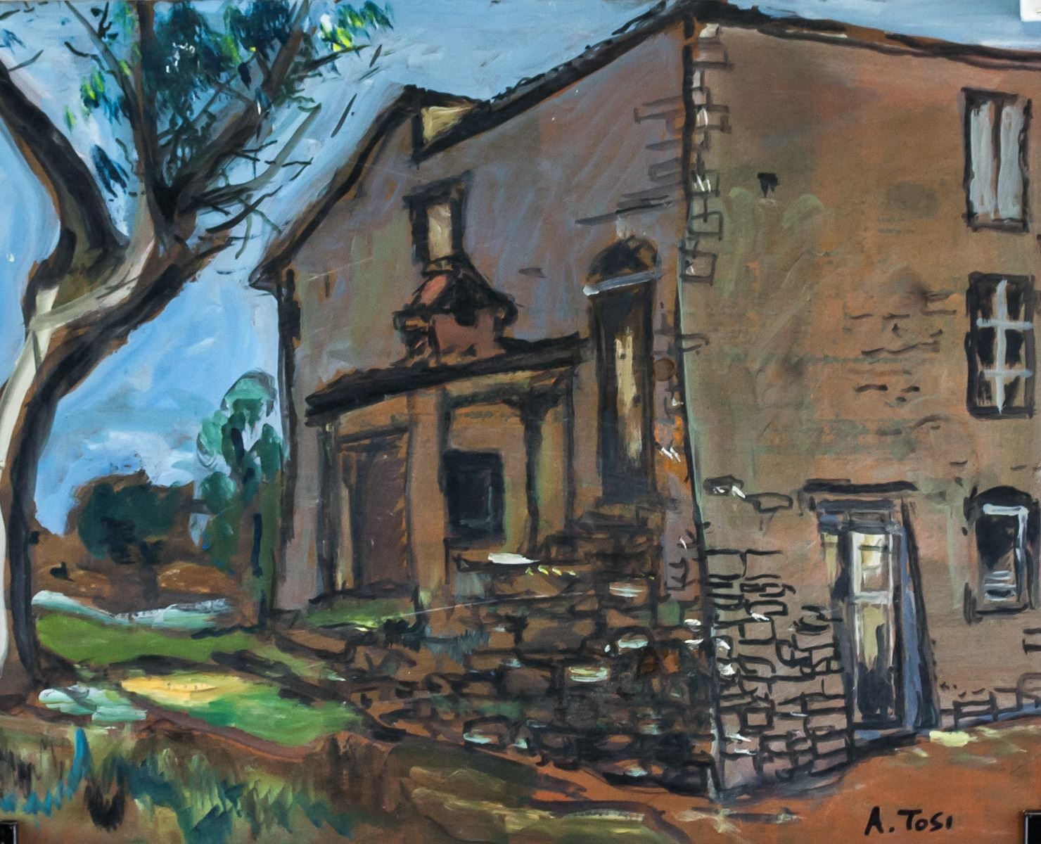 Oil on paper. Featuring a landscape scene of a building. Signed A. Tosi on the lower right corner. Attributed to Arturo Tosi (1871-1965, Italian). 32 x 40 cm (12.75 x 15.75 in). PROVENANCE: Southern Ontario estate