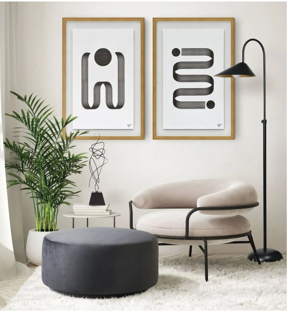 Contemporary abstract design, framed wall art measuring 24" x 36", ready to hang, new.