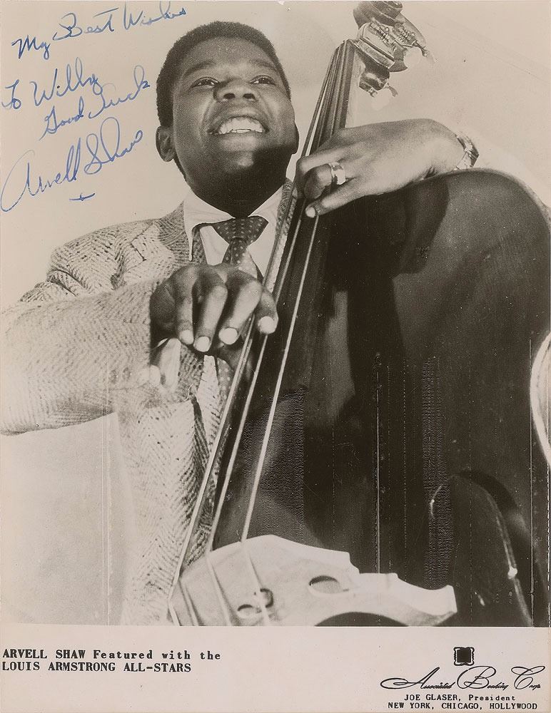 American jazz double-bassist (1923–2002), who is best known for his work with Louis Armstrong. He later worked at CBS with Russ Case, and performed with Teddy Wilson's trio and Benny Goodman. Terrific vintage glossy 7.5 x 9.75 publicity photo of Shaw excitedly playing his upright bass, signed and inscribed in fountain pen, "My best Wishes, To Willy, Good Luck, Arvell Shaw.” In very good condition, with trimmed edges, and scattered light creasing and surface impressions.