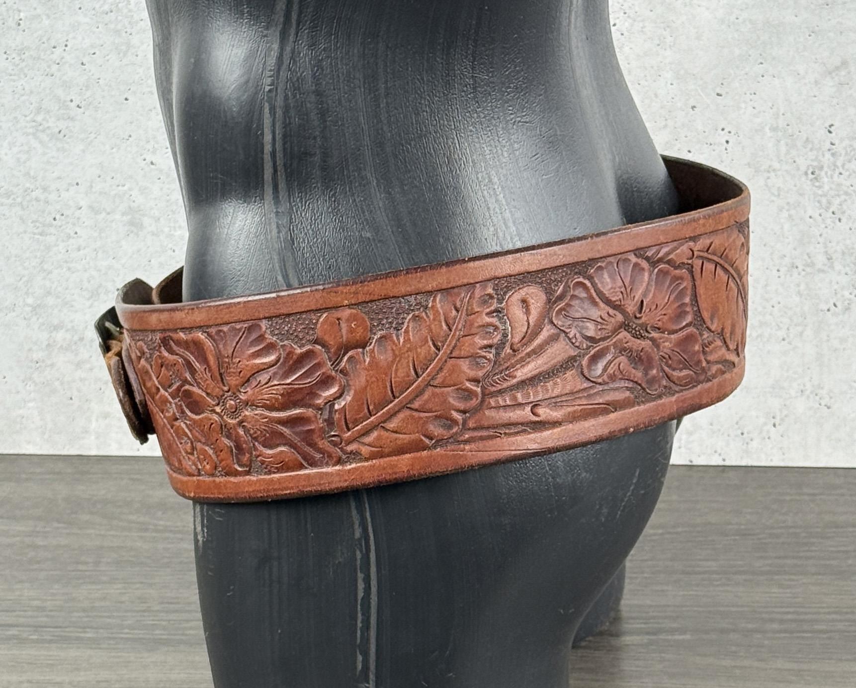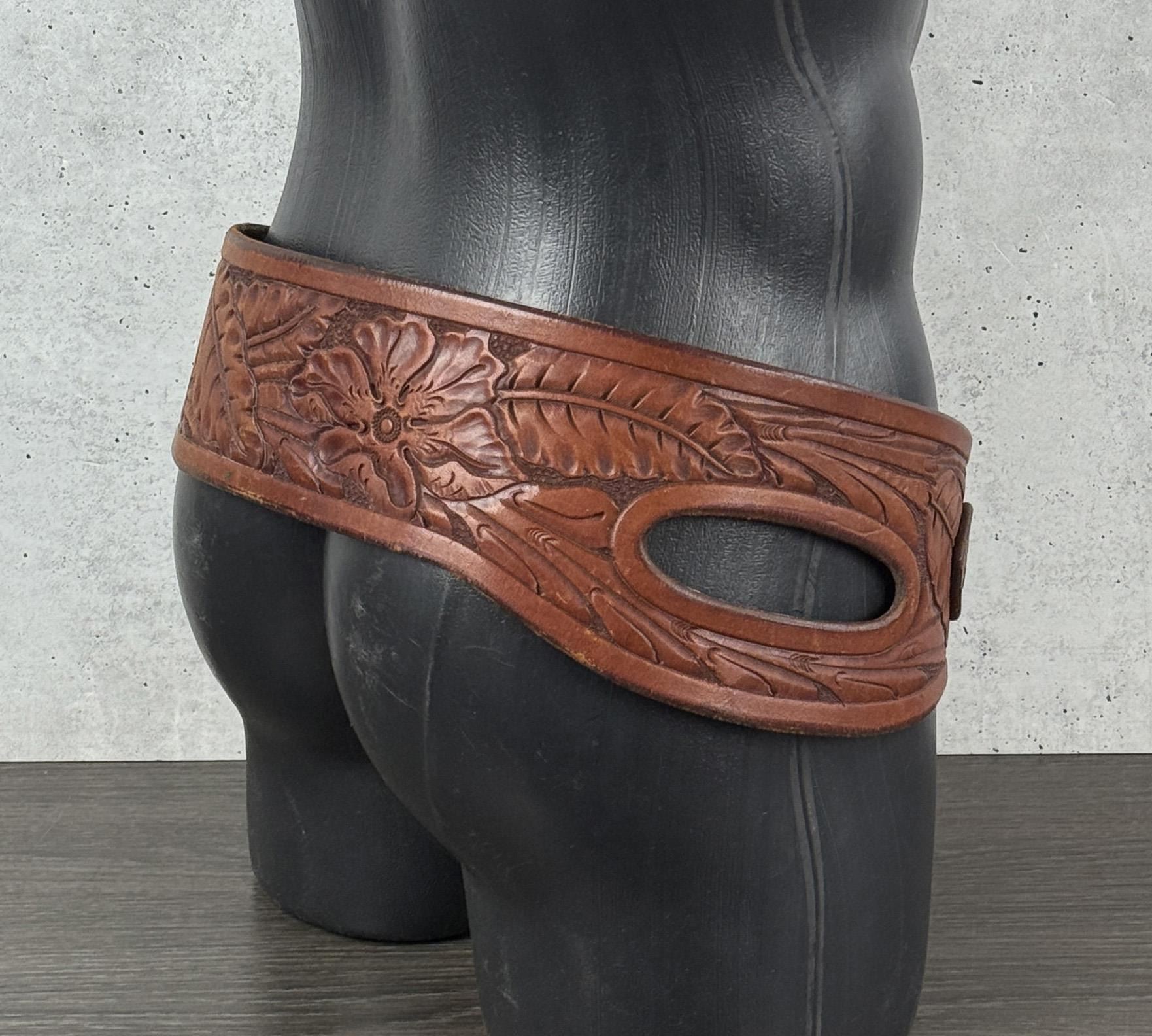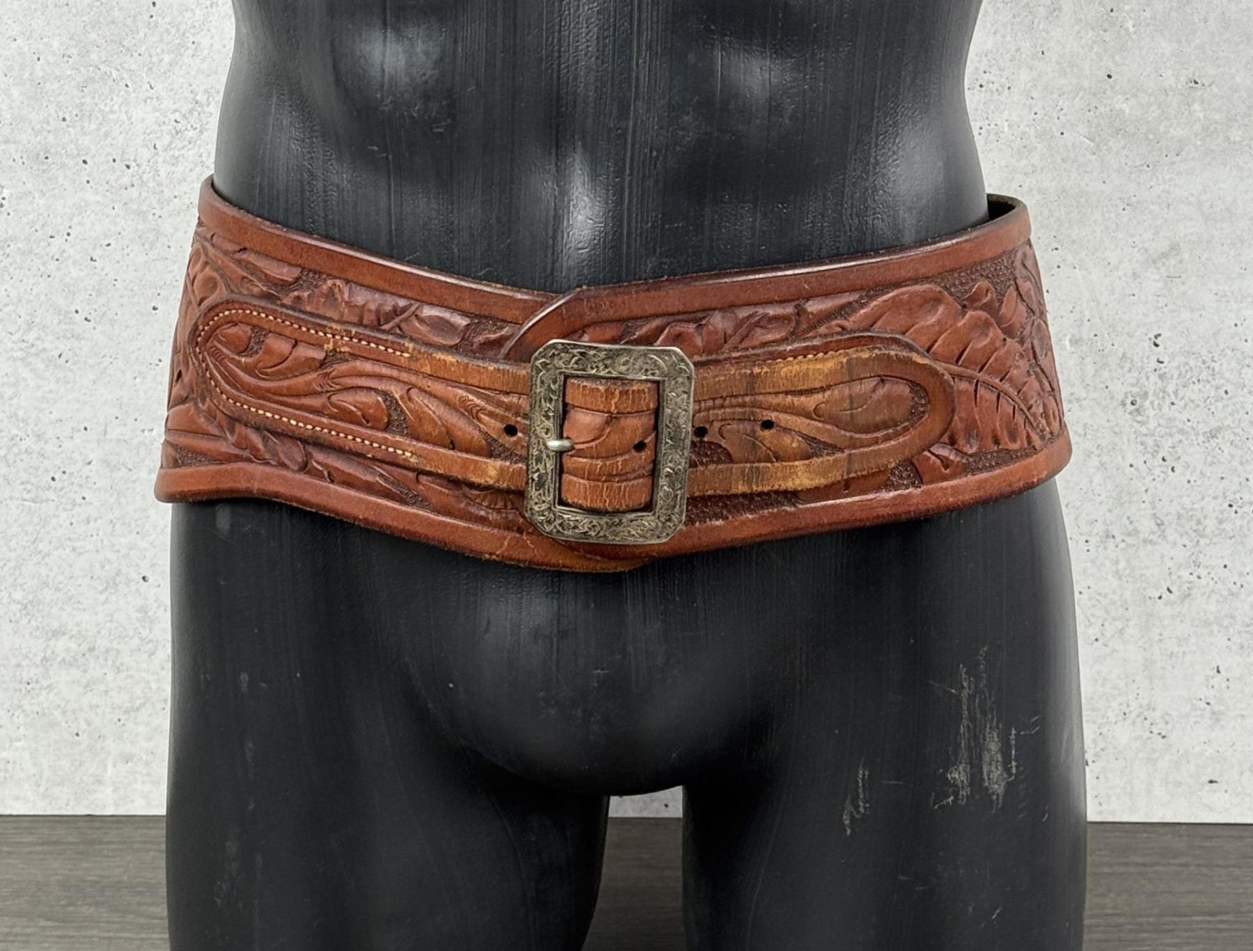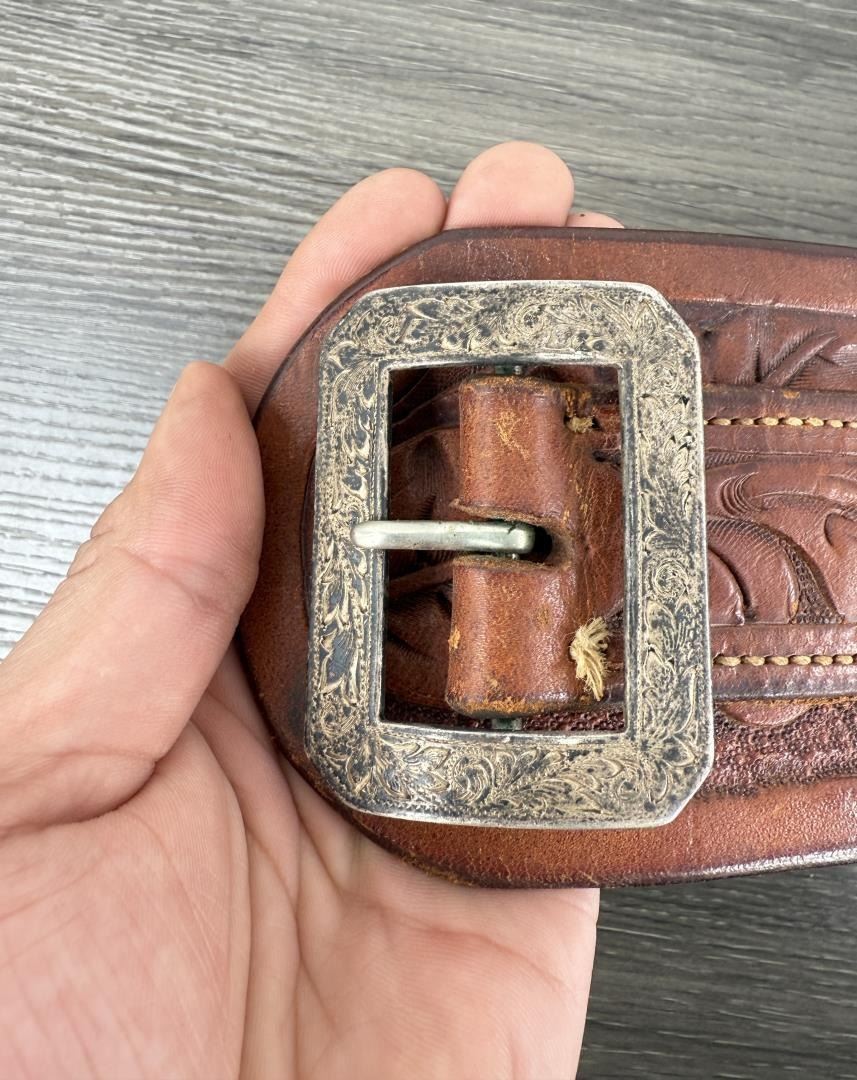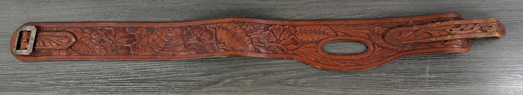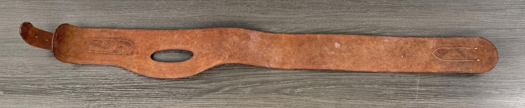 The belt is unmarked, but is very much in the style of his patented design. 44 1/2" long by 4 3/4" wide. Arvo Oswald Ojala February 21, 1920 – July 1, 2005 was a Hollywood technical advisor on the subject of quick-draw with a revolver.[1] He also worked as an actor; his most famous role was that of the unnamed man shot by Marshal Matt Dillon in the opening sequences of the long-running television series Gunsmoke. In August 1956, Ojala filed a patent application for his low-slung, metal-lined "Quick Draw Holster", and in April 1958, he was granted US Patent 2832519. His holster was publicly described in the New York Times on May 3, 1958.