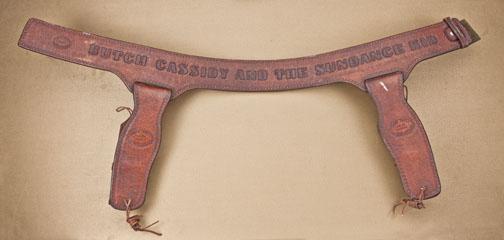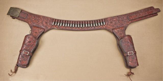 Arvo Ojala fancy one of a kind double gun rig for Colt single action army’s, 4-3/4” barrels, fully and finely carved and tooled. Inside marked Butch Cassidy and the Sundance Kid. With fancy limited edition Ojala buckle. Size 40 waist, silver plat cartridges, fine to excellent condition. Made to accompany lot number 583, Butch Cassidy one of a kind pair. Est: $500 - $1,000