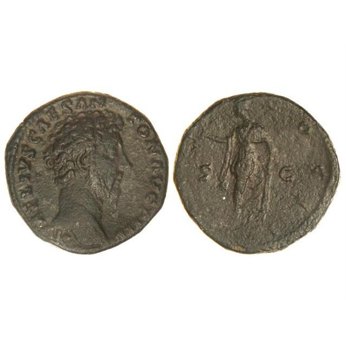 As. - 161-180 d.C. - MARCO AURELIO. - Anv.: AVRELIVS CAES. ANTON. AVG. PIIF. Busto descubierto a derecha. Rev.: (-) COS. II.- S. C. Deidad a izquierda. 11,4 grs. Pátina oscura. MBC-. - -