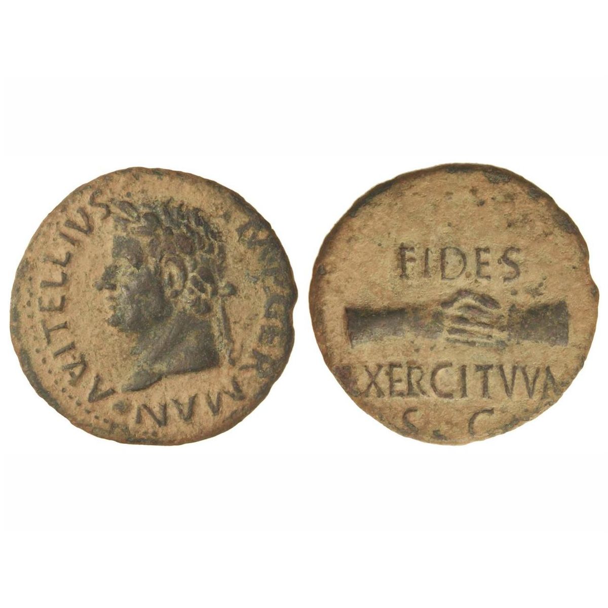 As. - 69 d.C. - VITELIO. - TARRACO. - Anv.: A. VITELLIVS IMP. GERMAN. Cabeza laureada a izquierda, debajo globo. Rev.: FIDES EXERCITVVM S. C. Manos enlazadas. 8,83 grs. Pátina oscura. MAGNÍFICO EJEMPLAR. AB-R143; C-34. EBC-. - -