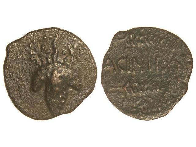 As. ACINIPO. Anv.: Racimo de uvas, a sus lados en la parte superior estrellas. Rev.: Dos espigas a derecha entre ambas ACINIPO. 4,60 grs. Pátina oscura. (Oxidaciones limpiadas). AB-49. MBC+.
