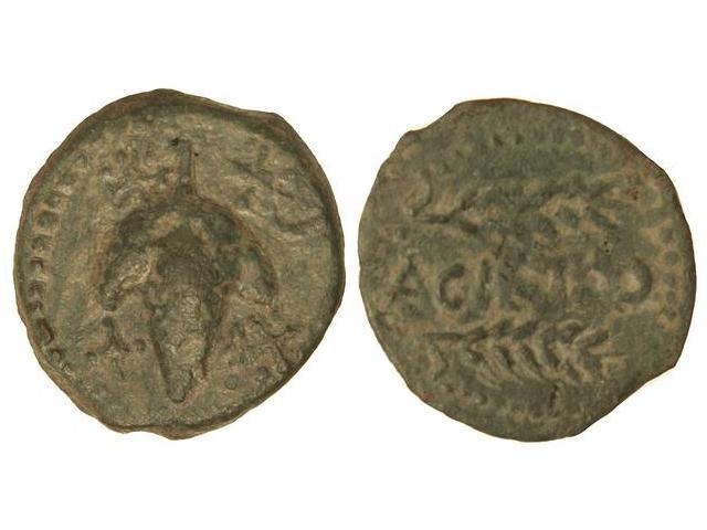 As. ACINIPO. Anv.: Racimo de uvas, en la parte superior estrella y estrella creciente, debajo 2 cruces. Rev.: Dos espigas a derecha, entre ambas ACINIPO. 7,90 grs. Pátina verde. (Pequeñas rayitas en anverso). AB-No cat.; Vill-9. MBC+.<