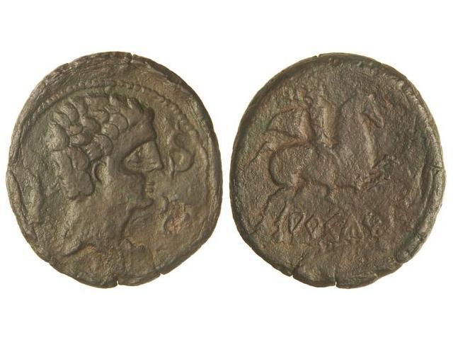 As. ARCEDURGI. Anv.: Cabeza masculina a derecha, delante dos delfines, detrás jabalí. Rev.: Jinete a derecha con palma y clámide. 15,10 grs. Pátina oscura. (Oxidaciones). AB-78. MBC-/BC+.
