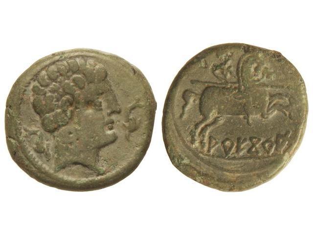 As. ARECORATAS. Anv.: Cabeza viril a derecha con dos delfines. Rev.: Jinete con lanza a derecha, debajo leyenda ibérica. 11,80 grs. Pátina verde. AB-85. MBC+.