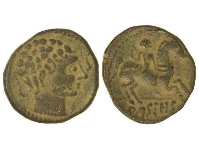 As. - ARSAOS. - Anv.: Cabeza barbada a derecha, arado y delfín. Rev.: Jinete con dardo a derecha, leyenda ibérica, encima línea. 10,10 grs. AE. Pátina verde. AB-145. MBC+. - -