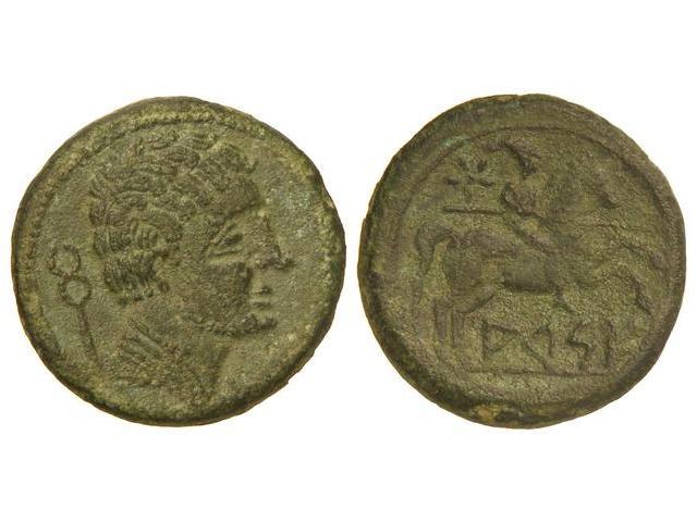 As. ARSE-SAGUNTO. Anv.: Cabeza masculina a derecha, detrás caduceo. Rev.: Jinete con lanza a derecha, encima estrella. ARSE. 15 grs. Pátina verde. ESCASA. AB-2072. EBC.