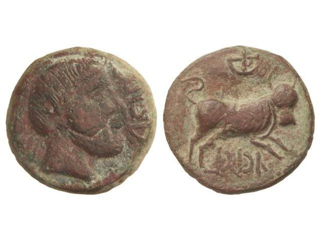 As. ASIDO. Anv.: Cabeza masculina a derecha, delante ASIDO. Rev.: Toro a derecha, encima creciente y estrella, debajo leyenda Libio-Fenicia. 14,70 grs. Pátina marrón rojiza. RARA. AB-153. MBC+/EBC-.