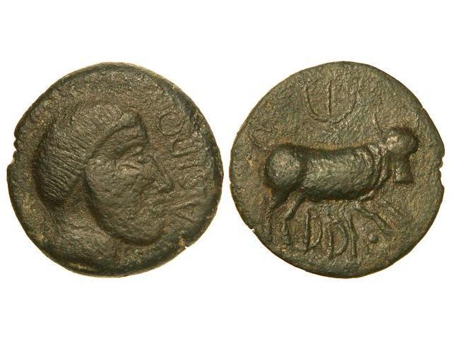 As. ASIDO. Anv.: Cabeza masculina a derecha, delante ASIDO. Rev.: Toro a derecha, escritura libio-fenicia. 14 grs. Pátina verde oscura. RARA. AB-153. MBC/MBC+.