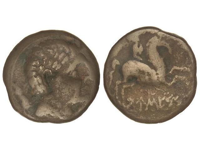 As. AUSESCEN. Anv.: Cabeza masculina a derecha, detrás jabalí. Rev.: Jinete con palma a derecha, debajo leyenda ibérica. 11,54 grs. AB-170. BC+.