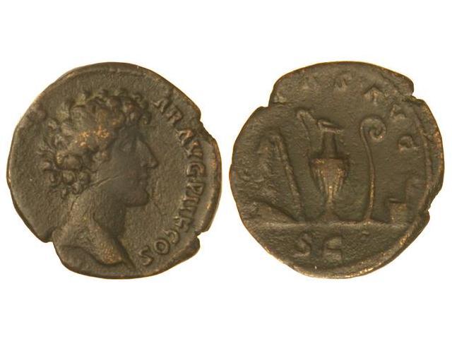 As. Acuñada el 140-144 d.C. MARCO AURELIO. Anv.: (AVRELIVS CAE)SAR AVG. P. II F. COS. Cabeza joven descubierta a derecha. Rev.: (PIET)AS AVG. S. C. Instrumentos sacerdotales. 7,40 grs. (Hoja en anverso). C-455. MBC.