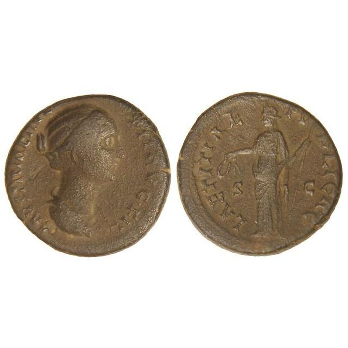 As. - Acuñada el 145-146 d.C. - FAUSTINA HIJA. - Anv.: FAVSTINAE AVG. PII AVG.FIL. Busto diademado a derecha. Rev.: LAETITIAE PVBLICAE S. C. Alegría estante a izquierda portando cetro y guirnalda. 12,74 grs. C-158. MBC-/MBC. - -