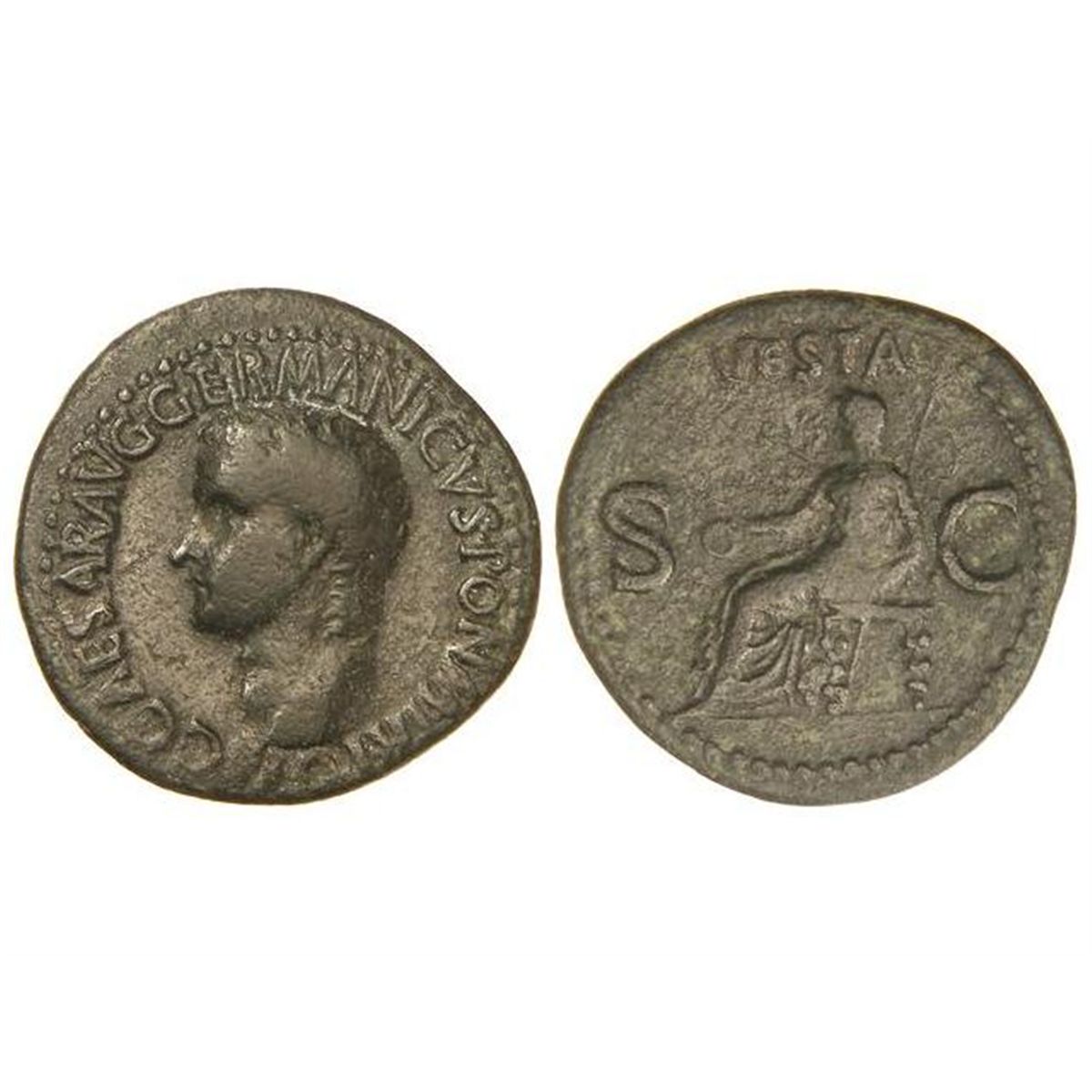 As. - Acuñada el 37 d.C. - CALÍGULA. - Anv.: C. CAESAR AVG. GERMANICVS PON. M. TR. POT. Cabeza descubierta a izquierda. Rev.: VESTA S. C. Vesta sentada a izquierda con cetro y pátera. 10,50 grs. Pátina oscura. C-27. MBC-. - -