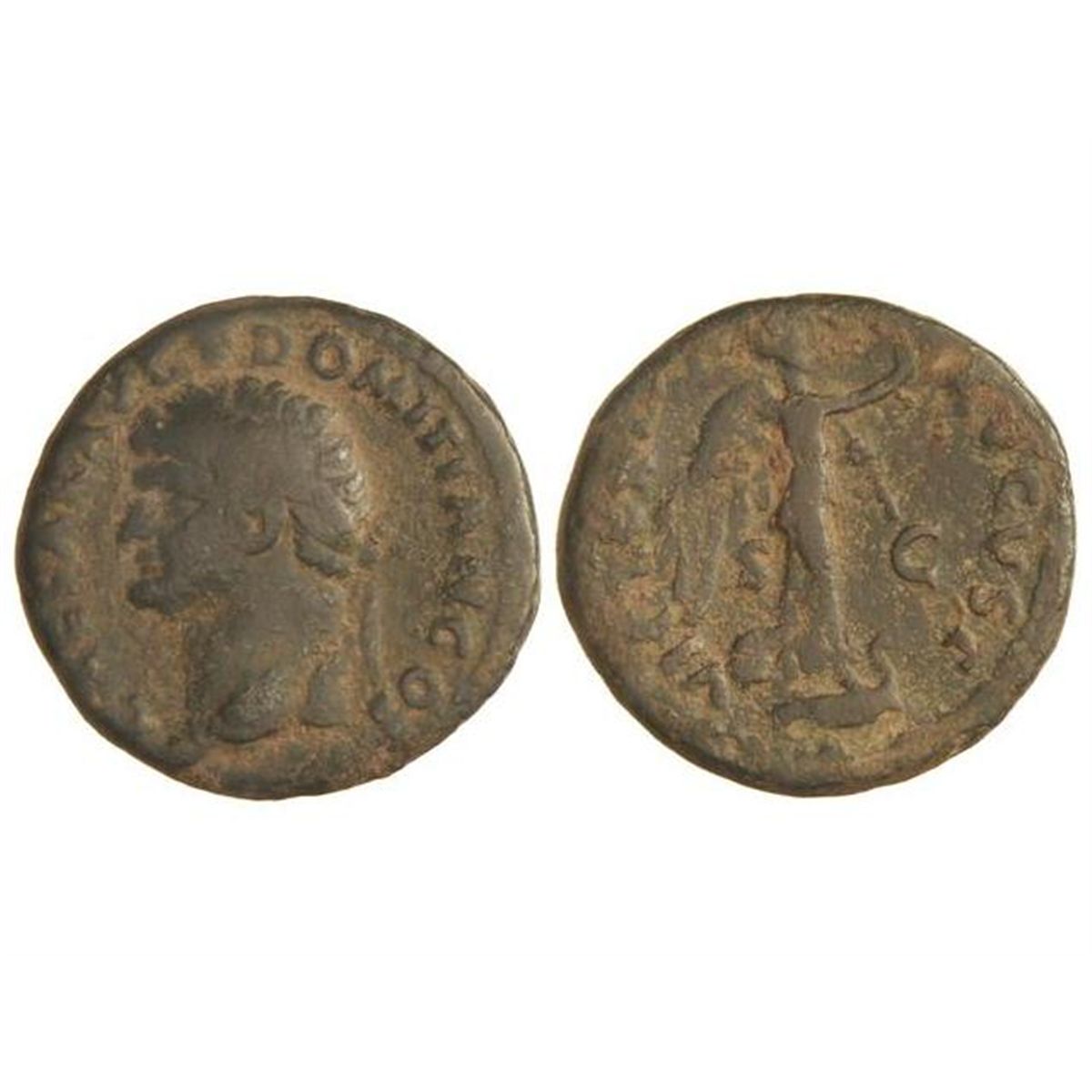 ROMAN COINS: ROMAN EMPIRE - As. - Acuñada el 72 d.C. - DOMICIANO. - Anv.: CAESAR AVG. F. DOMITIAN. COS. (II). Cabeza laureada a izquierda. Rev.: VICTOR(IA) AVGVST. S. C. Victoria en pie a derecha sobre proa de nave. 10,10 grs. Pátina oscura. C-629. MBC-. - -