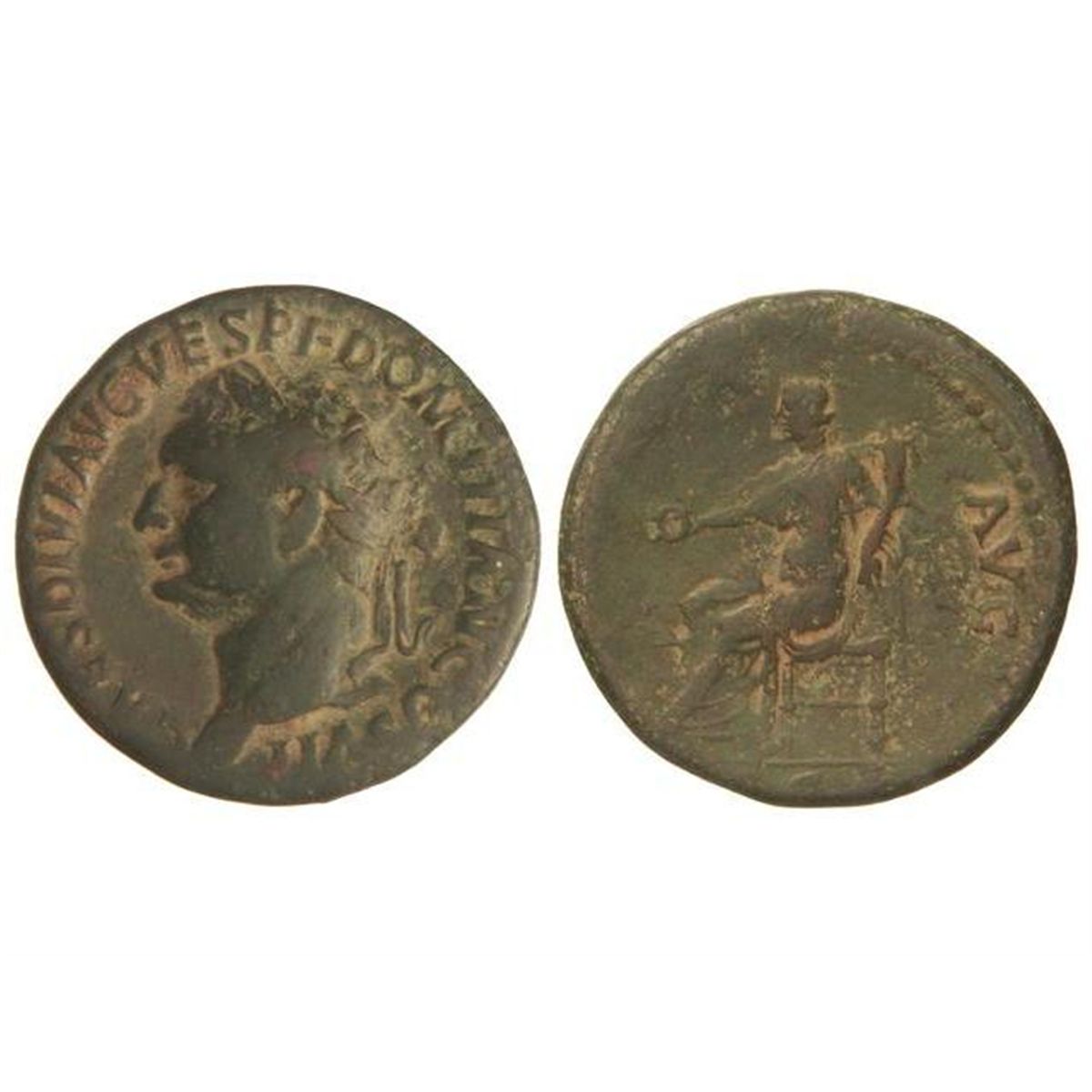 ROMAN COINS: ROMAN EMPIRE - As. - Acuñada el 80-81 d.C. - DOMICIANO. - Anv.: CAES. DIVI. AVG. VESP. F. DOMITIAN. COS. VII. Cabeza laureada a izquierda. Rev.: (CONCOR)DIA AVG. S. C. Concordia sentada a izquierda. 9,40 grs. Pátina verde oscura. MBC-. - -