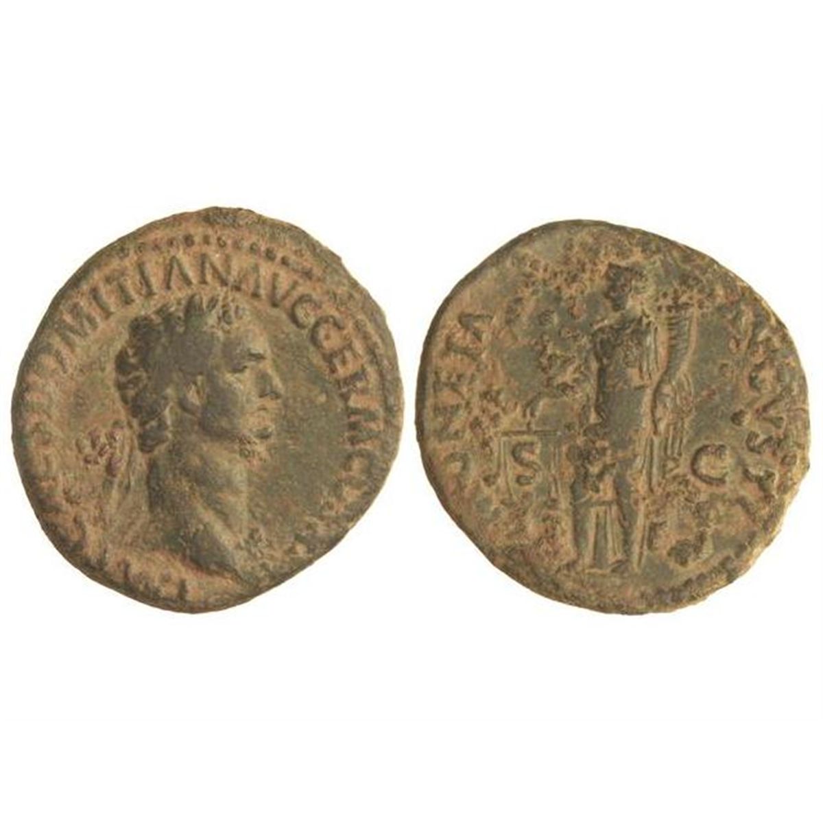 ROMAN COINS: ROMAN EMPIRE - As. - Acuñada el 81-96 d.C. - DOMICIANO. - Anv.: IMP. CAES. DOMITIAN. AVG. GERM. COS. XII. Cabeza laureada a derecha. Rev.: MONETA AVGVSTI S. C. Moneda en pie con cornucopia y balanza. 9,60 grs. Pátina verde. MBC-. - -