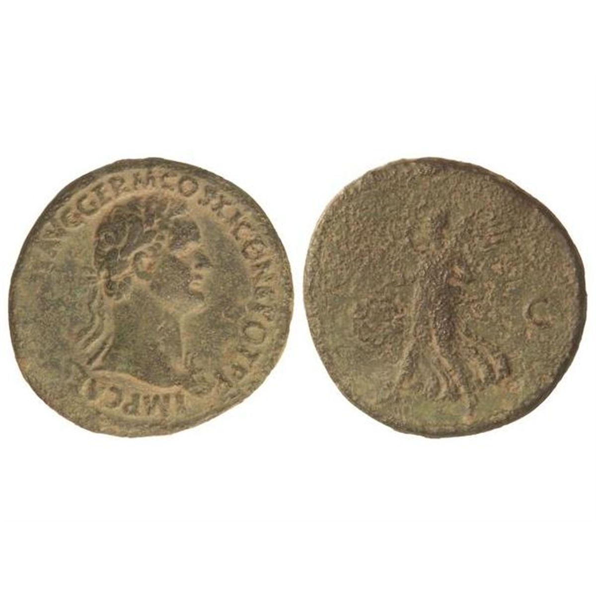 ROMAN COINS: ROMAN EMPIRE - As. - Acuñada el 85 d.C. - DOMICIANO. - Anv.: IMP. CAES. (DOMIT.) AVG. GERM. COS. XI CENS. P. P. Busto laureado a derecha. Rev.: (S.) C. Victoria en marcha a izquierda, con escudo con leyenda (S.P.Q.R.). 10,80 grs. Pátina verde. C-468. MBC-/BC-. - -