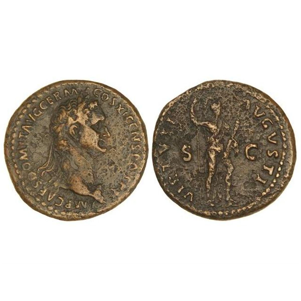 As. - Acuñada el 86 d.C. - DOMICIANO. - Anv.: IMP. CAES. DOMIT. AVG. GERM. COS. XI CENS. PER. P. P. Busto laureado de Apolo a derecha. Rev.: VIRTVTI AVGVSTI S.C. Valor estante a derecha, portando lanza y parazonio, con pie sobre casco. (Oxidaciones). C-647. (MBC). - -