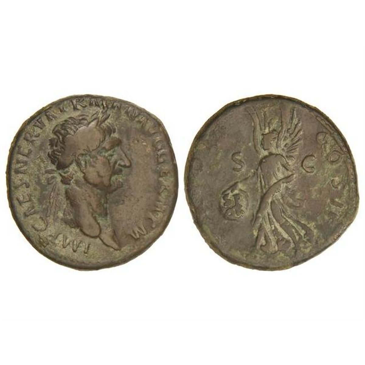 As. - Acuñada el 98 d.C. - TRAJANO. - Anv.: IMP. CAES. NERVA TRIAN. AVG. GERM. P. M. Busto laureado a derecha. Rev.: (TR. POOT.) COS. II (P. P.) S. C. Victoria en marcha a izquierda con palma y escudo con leyenda S. P. Q. R. 11 grs. Pátina oscura. C-617. MBC-. - -