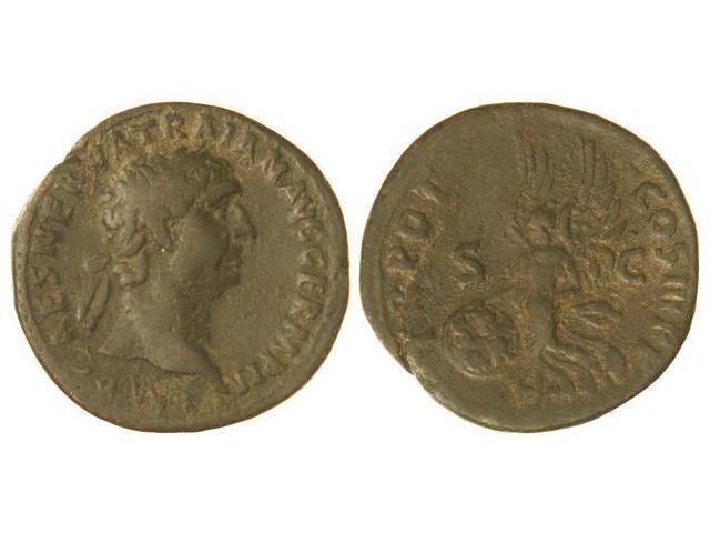 As. Acuñada el 99-100 d.C. TRAJANO. Anv.: IMP. CAES. NERVA TRAIAN. AVg. GERM. P. M. Busto laureado a derecha. Rev.: TR. POT. COS. III P. P. S. C. Victoria en marcha a izquierda con escudo con S.P.Q.R. 10,90 grs. Pátina oscura. C-628. MBC.