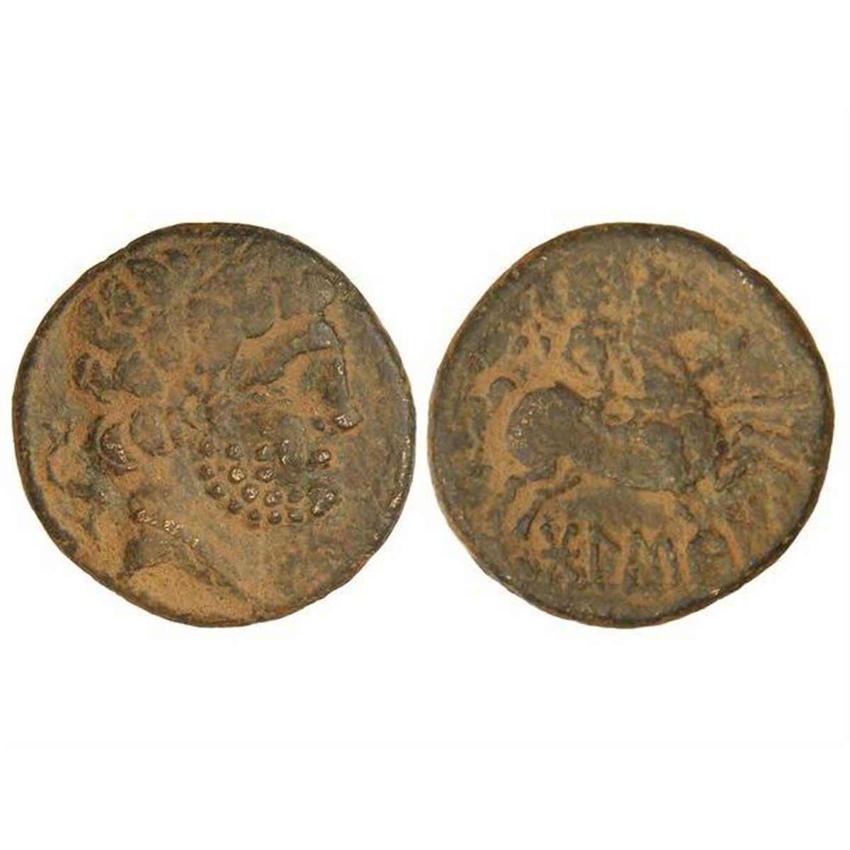 As. - BOLSCAN. - Anv.: Cabeza barbada a derecha, detrás delfín. Rev.: Jinete con lanza a derecha, encima estrella, debajo leyenda ibérica. 8,02 grs. Pátina verde. AB-1918. MBC+/MBC. - -