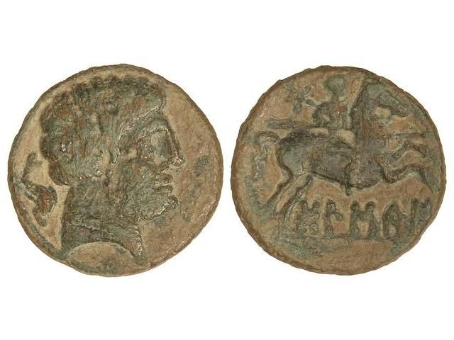 As. BOLSCAN. Anv.: Cabeza barbada a derecha, detrás delfín. Rev.: Jinete con lanza a derecha, encima estrella, debajo leyenda ibérica. 6,56 grs. Pátina verde. AB-1918. MBC-.