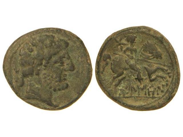 As. - BOLSCAN. - Anv.: Cabeza barbada a derecha, detrás delfín. Rev.: Jinete con lanza a derecha, encima estrella, debajo leyenda ibérica. 9,10 grs. AE. Pátina verde. AB-1918. MBC+. - -