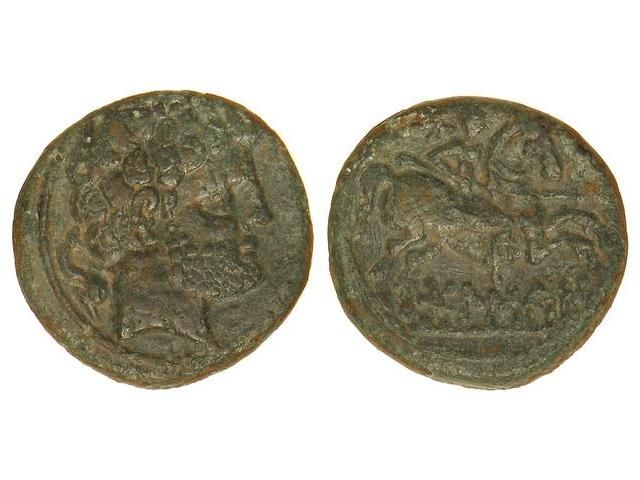 As. BOLSCAN. Anv.: Cabeza masculina a derecha, detrás delfín. Rev.: Jinete con lanza a derecha, debajo leyenda ibérica. 9,70 grs. Pátina verde. AB-1918. MBC+.