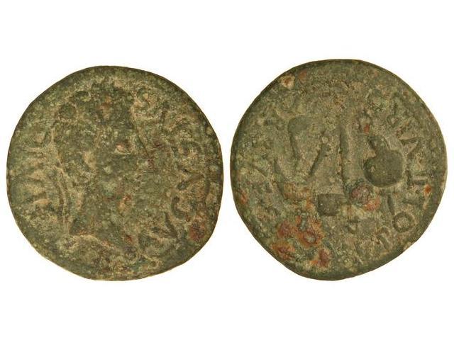 As. CARTAGONOVA. Anv.: Cabeza laureada de Augusto. Rev.: En el centro, aspérgilo, símpulo, segur y ápex. 12,90 grs. CU. Pátina verde. AB-577. MBC-.