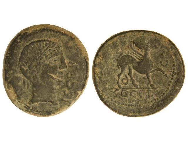 As. CASTULO. Anv.: Cabeza laureada a derecha, rodeada de (SA)CAL ISCER. Rev.: Esfinde a derecha. SOCED. CAST. 23,90 grs. CU. Pátina verde. (Marca en la cara). AB-709. MBC+.