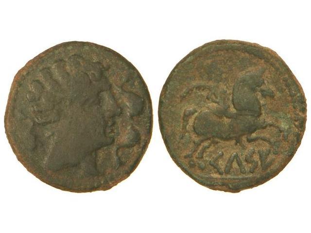 As. - CELSE. - Anv.: Cabeza masculina a derecha, con manto y fíbula, alrededor de 3 delfines. Rev.: Jinete con palma a derecha, debajo leyenda ibérica. 12 grs. AE. Pátina verde. AB-771. MBC-/MBC. - -