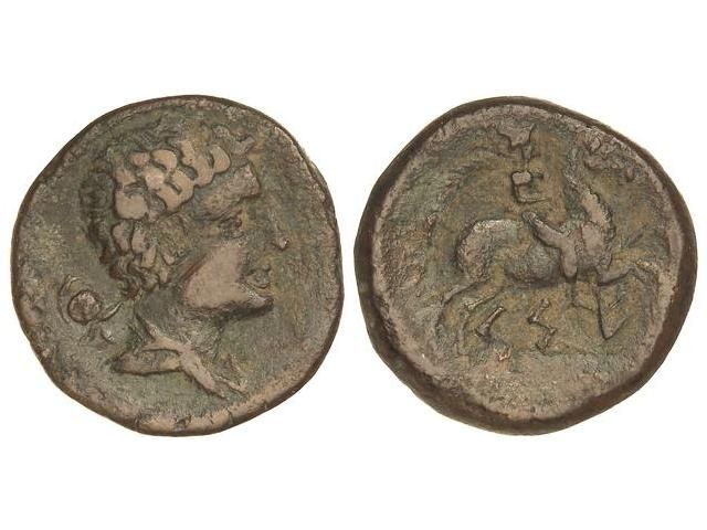 As. CESE. Anv.: Cabeza masculina a derecha, detrás casco. Rev.: Jinete con palma a derecha, debajo leyenda ibérica. 11,55 grs. Pátina rojiza. AB-2276. MBC.