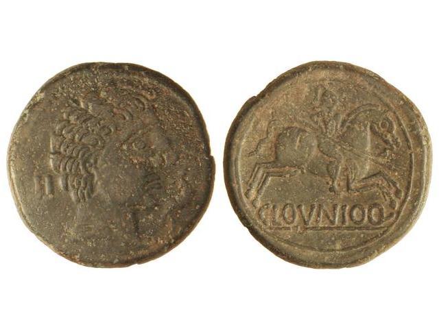 As. CLOUNIOQ. Anv.: Cabeza masculina a derecha, delante delfín y detrás signos II. Rev.: Jiente con lanza a derecha, debajo CLOVNIOQ. 14,60 grs. Pátina verde. AB-834. MBC.