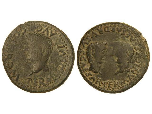 As. COLONIA ROMULA. Anv.: Cabeza laureada de Tiberio a izquierda. Rev.: Cabezas enfrentadas de Germánico y Druso. 15,50 grs. CU. Pátina verde. AB-2016. MBC/MBC+.